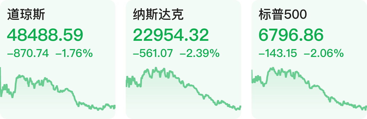 美国三大指数集体收跌,道指跌1.76%,标普500指数跌2.06%,纳指跌2.39%。大型科技股多数下跌,甲骨文、博通跌超5%,英伟达、特斯拉跌超4%,亚马逊、苹果跌超3%。英特尔涨超3%,美光科技小幅上涨。热门中概股多数下跌,纳斯达克中国金龙指数跌1.45%,哔哩哔哩跌超6%,小鹏汽车、蔚来跌超3%,拼多多、理想汽车跌超2%,阿里巴巴、京东跌超1%。