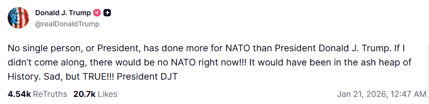 当地时间1月20日,美国总统特朗普发文称,没有任何一位总统比他为北约做出过更多的贡献,如果没有他的参与,北约已不复存在。“如果没有我,北约今天已不复存在!它早就被扫入历史的垃圾堆了。”