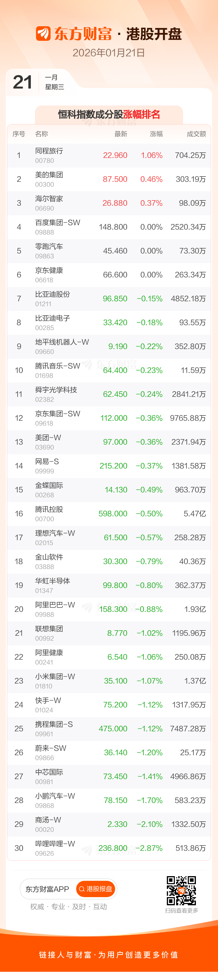 港股1月21日低开,恒生指数开盘报26397.04点,跌90.47点,跌幅0.34%;恒生科技指数开盘报5643.62点,跌39.82点,跌幅0.7%。恒生指数成分股中恒安国际、紫金矿业、恒隆地产涨幅居前,中通快递-W、中芯国际、泡泡玛特跌幅靠前。恒生科技指数成分股中同程旅行、美的集团、海尔智家涨幅居前,哔哩哔哩-W、商汤-W、小鹏汽车-W跌幅靠前。