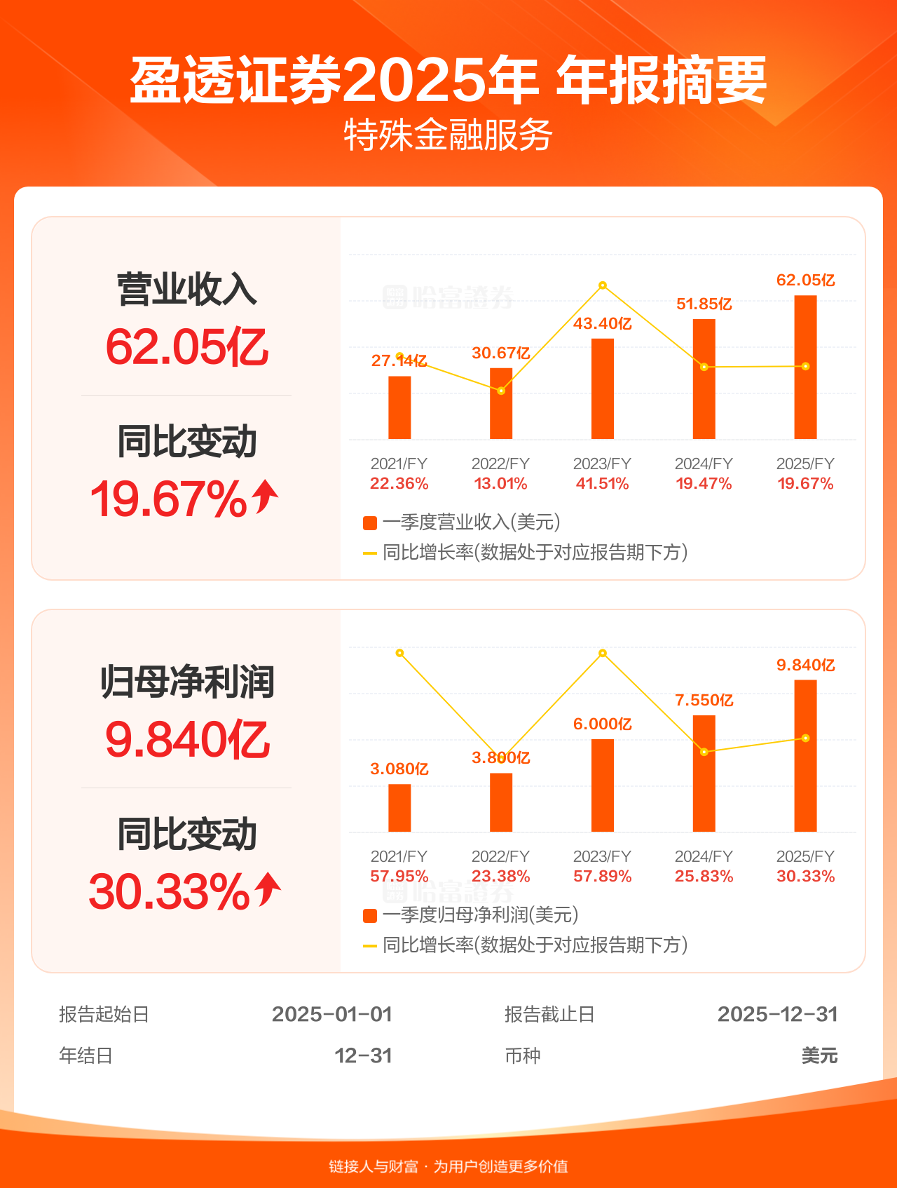 盈透证券1月20日发布年报业绩,截至2025年12月31日的12个月内,该公司营业收入62.05亿美元,同比增长19.67%;公司权益持有人应占溢利(归母净利润)9.84亿美元,同比增长30.33%,低于机构一致预测的9.97亿美元。