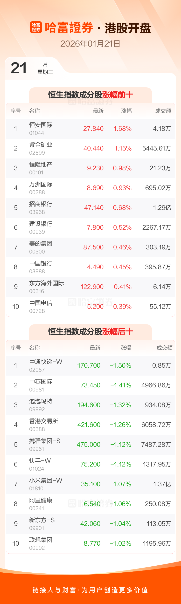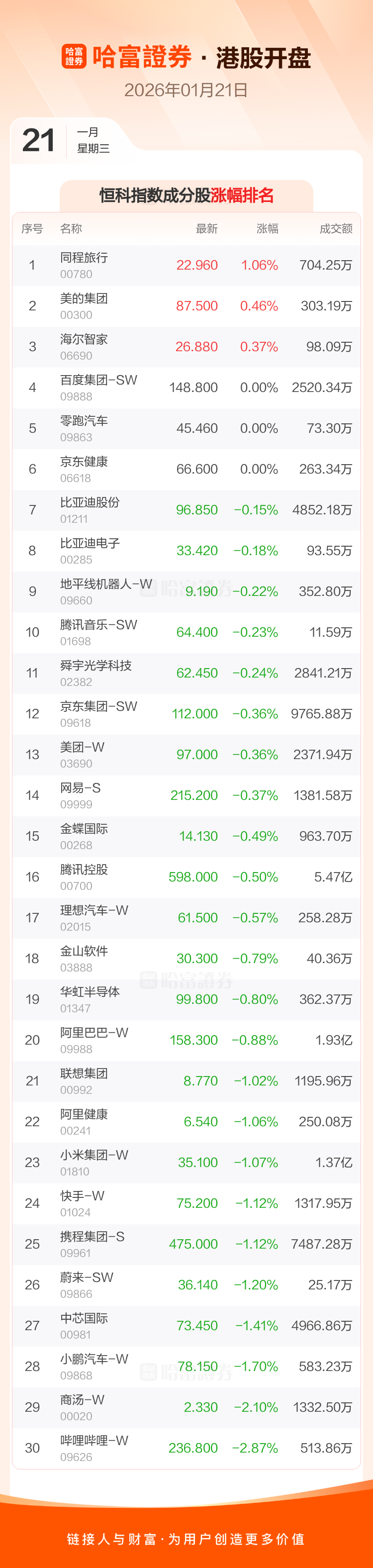 港股1月21日低开 ,恒生指数开盘报26397.04点,跌90.47点,跌幅0.34%;恒生科技指数开盘报5643.62点,跌39.82点,跌幅0.7%。恒生指数成分股中恒安国际、紫金矿业、恒隆地产涨幅居前,中通快递-W、中芯国际、泡泡玛特跌幅靠前。恒生科技指数成分股中同程旅行、美的集团、海尔智家涨幅居前,哔哩哔哩-W、商汤-W、小鹏汽车-W跌幅靠前。