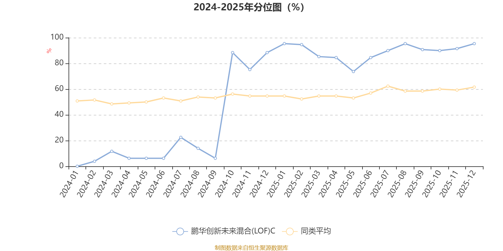 通过所选区间该基金净值增长率分位图,可以观察该基金与同类基金业绩比较情况。图为坐标原点到区间内某时点的净值增长率在同类基金中的分位数。