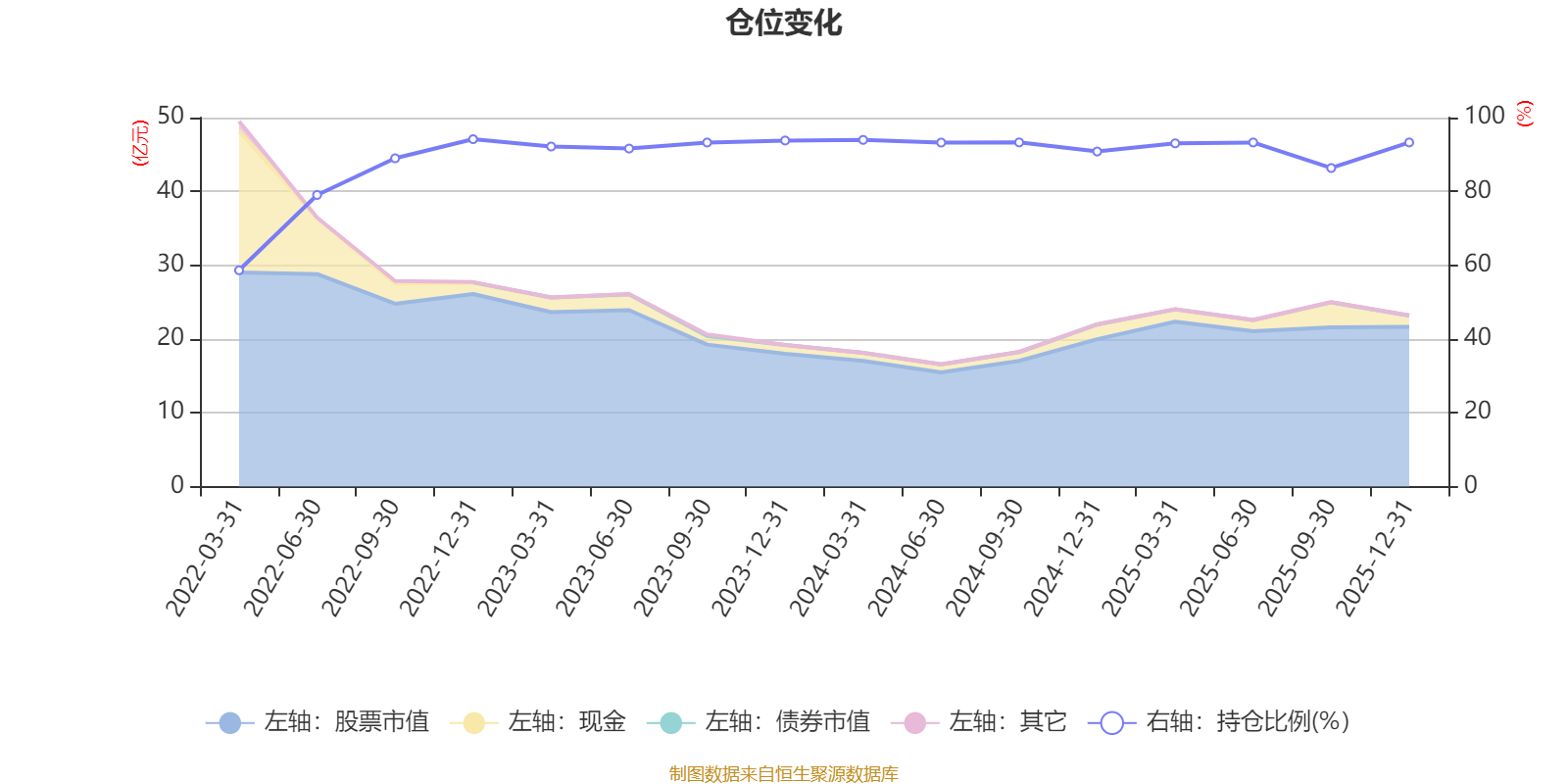 据定期报告数据统计,近三年平均股票仓位为92.33%,同类平均为86.13%。2022年末基金达到94.15%的最高仓位,2022年一季度末最低,为58.62%。