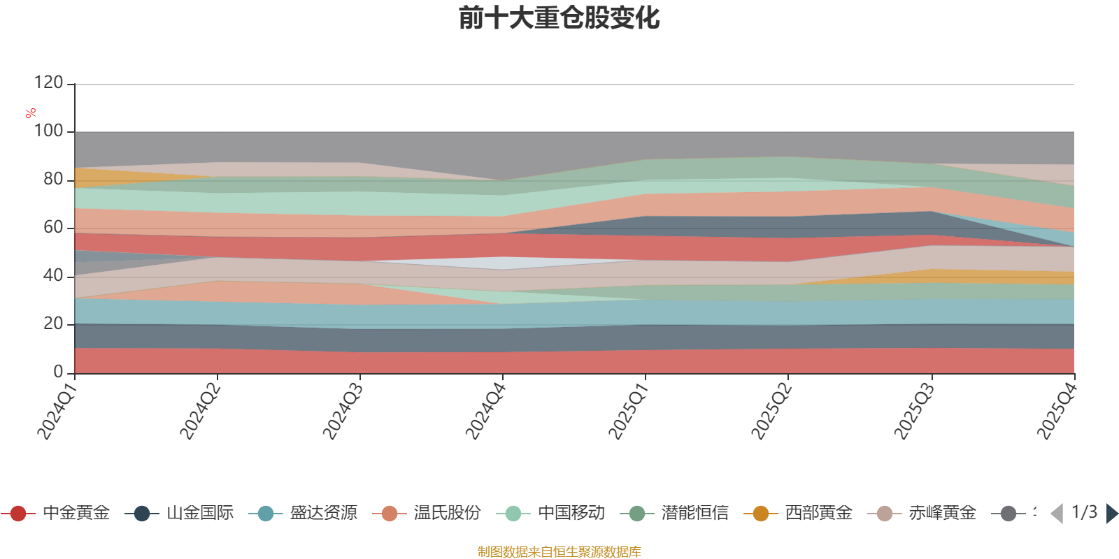 该基金持股集中度较高,近2年前十大重仓股集中度长期超过60%。截至2025年四季度末,基金十大重仓股分别是赤峰黄金、山金国际、盛达资源、中金黄金、山东黄金、湖南黄金、兴业银锡、潜能恒信、株冶集团、西部黄金。