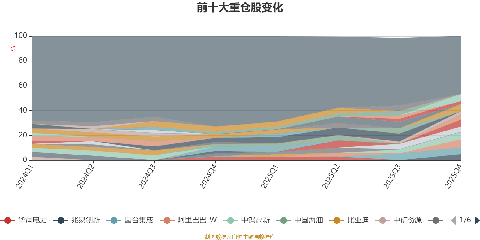 截至2025年四季度末,基金重仓股分别是阿里巴巴-W、中钨高新、海光信息、北方华创、晶合集成、中芯国际、兆易创新、中稀有色、工业富联、华虹半导体、华虹公司。