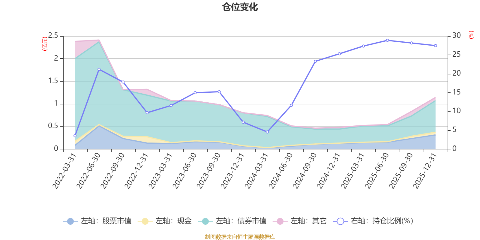 据定期报告数据统计,近三年平均股票仓位为18.77%,同类平均为19.14%。2025年上半年末基金达到28.85%的最高仓位,2022年一季度末最低,为3.5%。