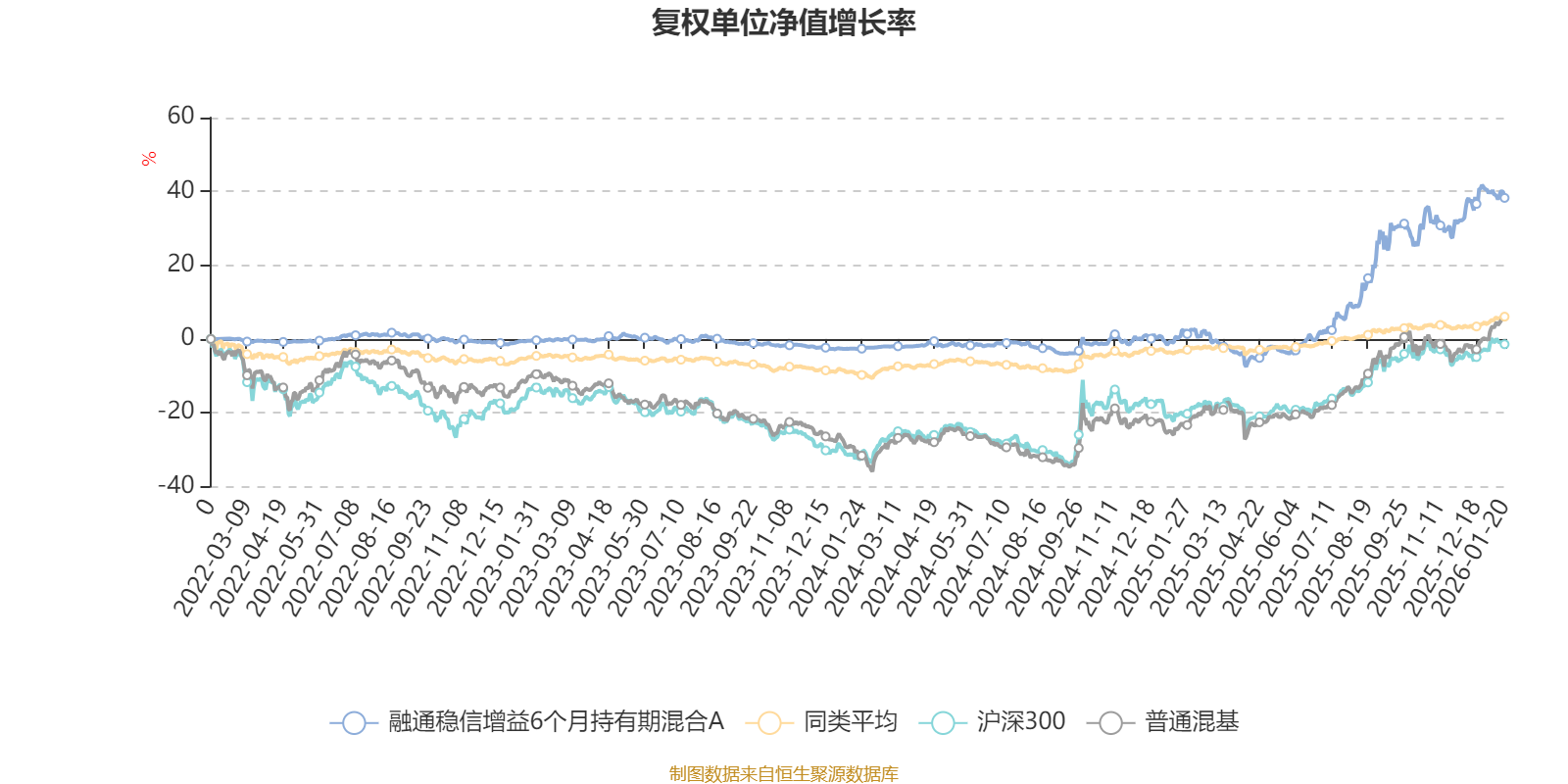 截至1月20日,融通稳信增益6个月持有期混合A近三个月复权单位净值增长率为8.71%,位于同类可比基金22/629;近半年复权单位净值增长率为29.79%,位于同类可比基金2/629;近一年复权单位净值增长率为37.35%,位于同类可比基金5/626;近三年复权单位净值增长率为38.59%,位于同类可比基金7/564。