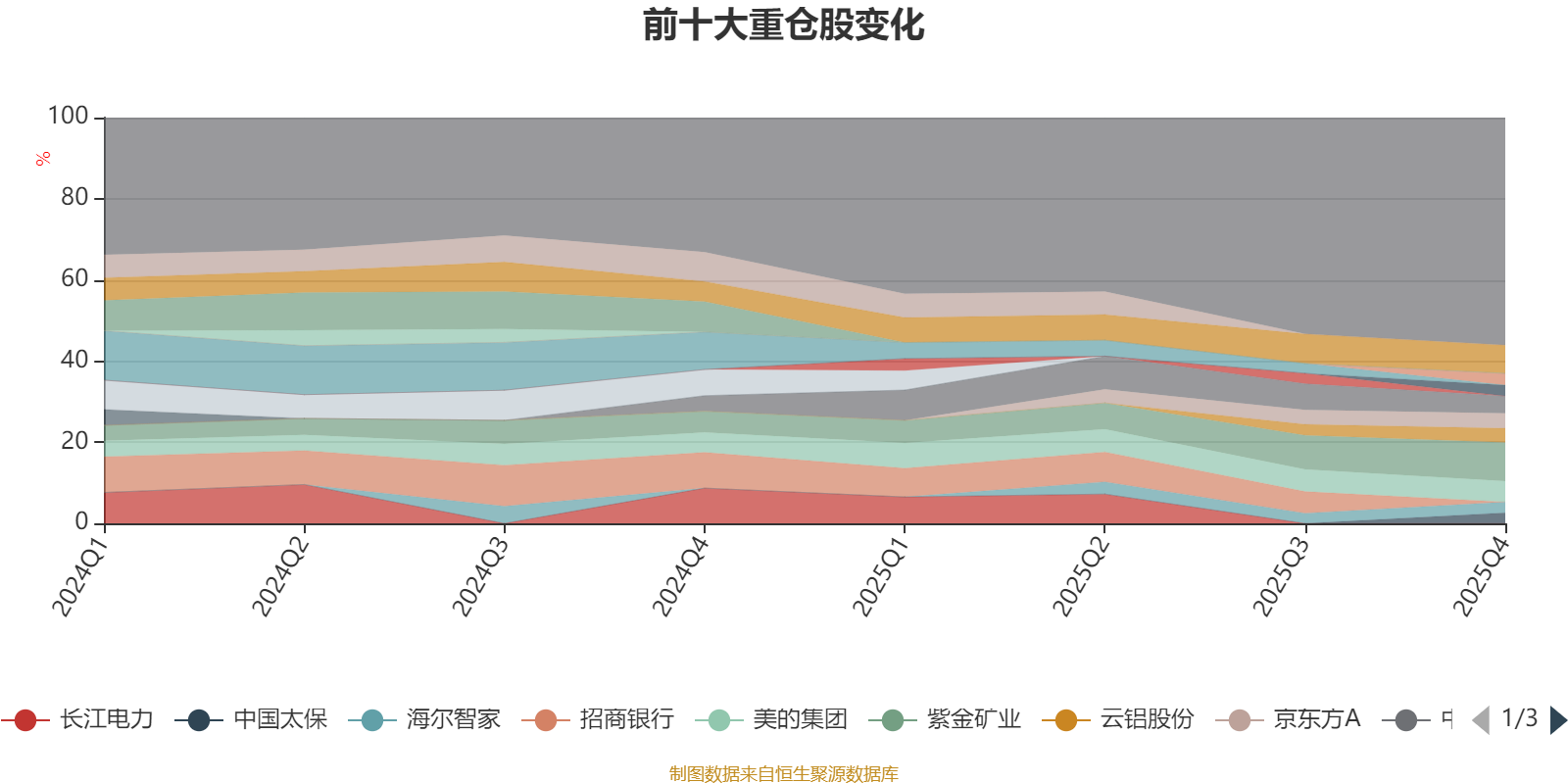 截至2025年四季度末,基金十大重仓股分别是紫金矿业、宁德时代、美的集团、中国移动、京东方A、云铝股份、杭州银行、新易盛、海尔智家、中国太保。