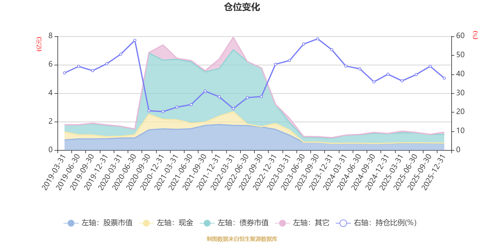 据定期报告数据统计,近三年平均股票仓位为44.71%,同类平均为72.46%。2023年三季度末基金达到58.66%的最高仓位,2020年末最低,为20.31%。