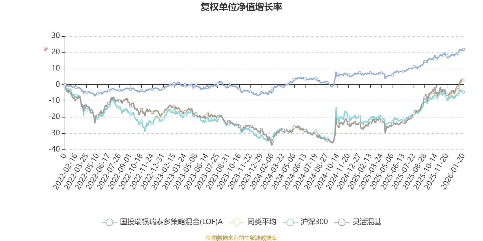截至1月20日,国投瑞银瑞泰多策略混合(LOF)A近三个月复权单位净值增长率为5.05%,位于同类可比基金858/1286;近半年复权单位净值增长率为10.24%,位于同类可比基金948/1286;近一年复权单位净值增长率为13.97%,位于同类可比基金1023/1286;近三年复权单位净值增长率为22.27%,位于同类可比基金488/1286。