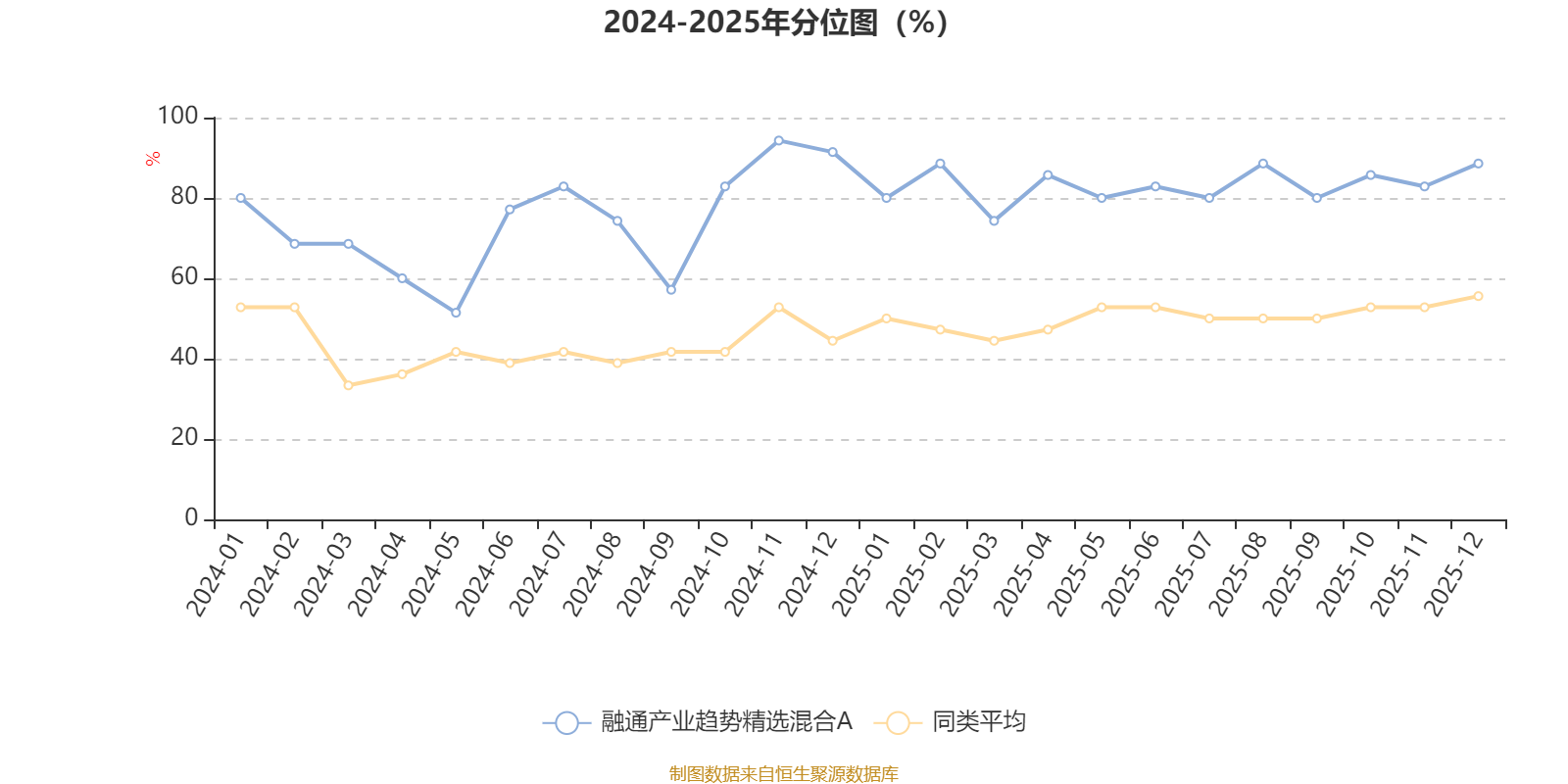 通过所选区间该基金净值增长率分位图,可以观察该基金与同类基金业绩比较情况。图为坐标原点到区间内某时点的净值增长率在同类基金中的分位数。