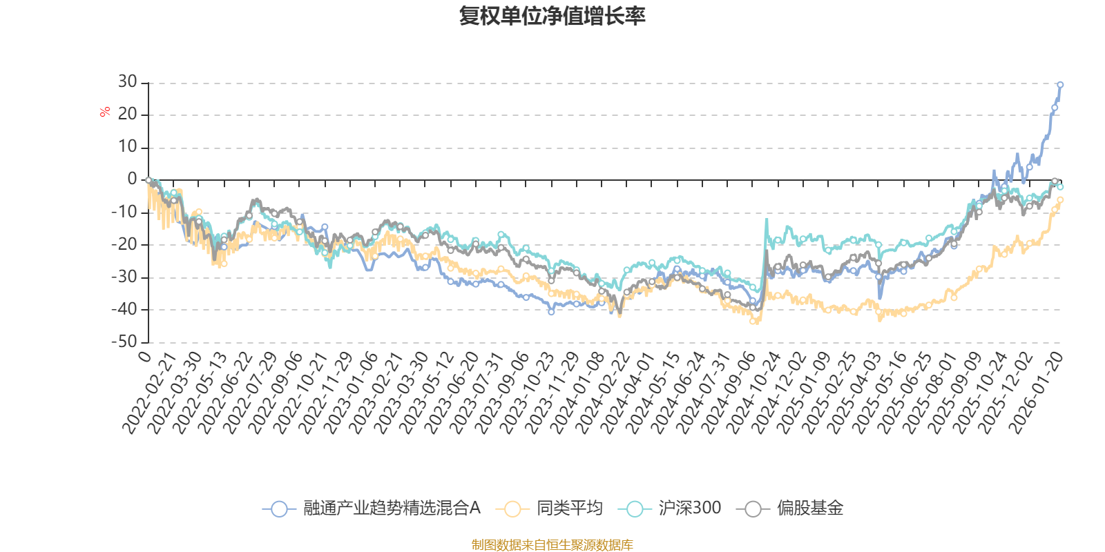 截至1月20日,融通产业趋势精选混合A近三个月复权单位净值增长率为33.90%,位于同类可比基金5/49;近半年复权单位净值增长率为61.50%,位于同类可比基金13/49;近一年复权单位净值增长率为84.51%,位于同类可比基金9/44;近三年复权单位净值增长率为67.22%,位于同类可比基金5/30。