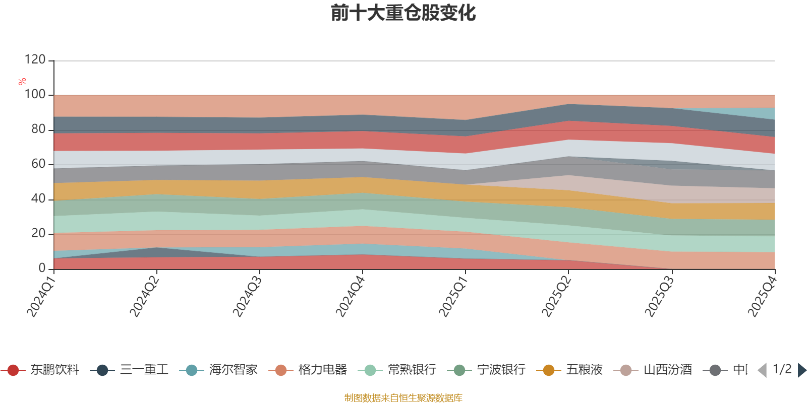 该基金持股集中度较高,且持股标的较为稳定,近2年前十大重仓股集中度长期超过60%。截至2025年四季度末,基金十大重仓股分别是中国平安、美的集团、格力电器、贵州茅台、招商银行、宁波银行、五粮液、常熟银行、山西汾酒、泸州老窖。