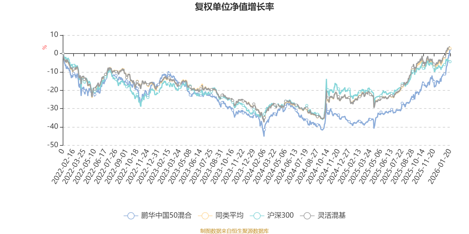 截至1月20日,鹏华中国50混合近三个月复权单位净值增长率为24.12%,位于同类可比基金74/1286;近半年复权单位净值增长率为46.23%,位于同类可比基金166/1286;近一年复权单位净值增长率为65.39%,位于同类可比基金148/1286;近三年复权单位净值增长率为15.56%,位于同类可比基金627/1286。