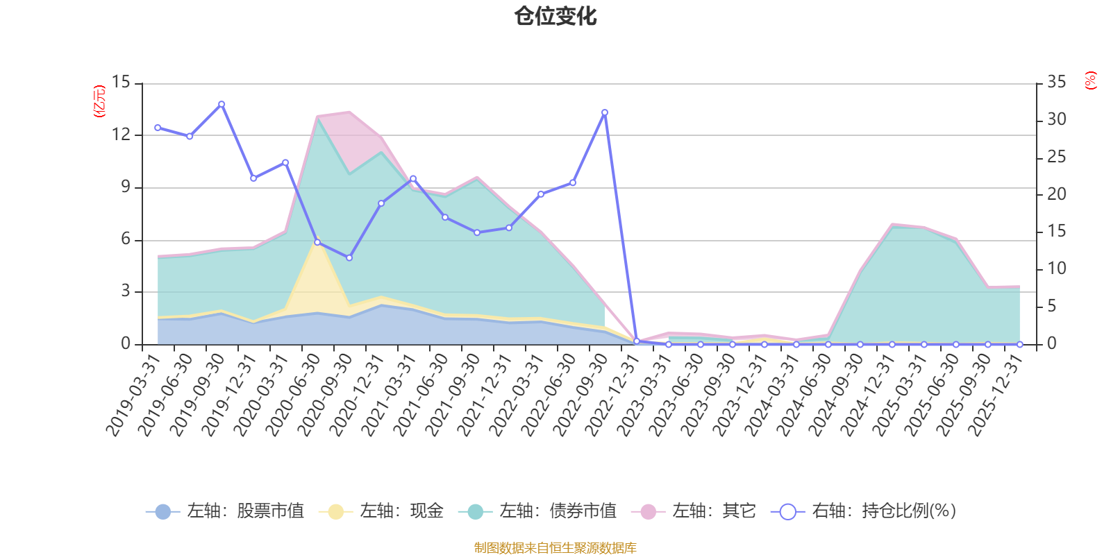 据定期报告数据统计,近三年平均股票仓位为0%,同类平均为54.08%。2019年三季度末基金达到32.2%的最高仓位,2022年末最低,为0.44%。