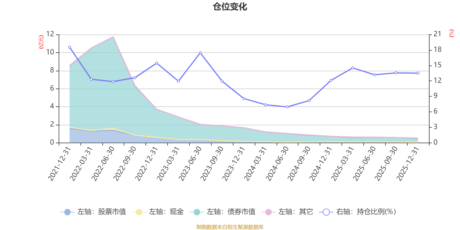 据定期报告数据统计,近三年平均股票仓位为11.61%,同类平均为19.14%。2021年末基金达到18.54%的最高仓位,2024年上半年末最低,为6.96%。