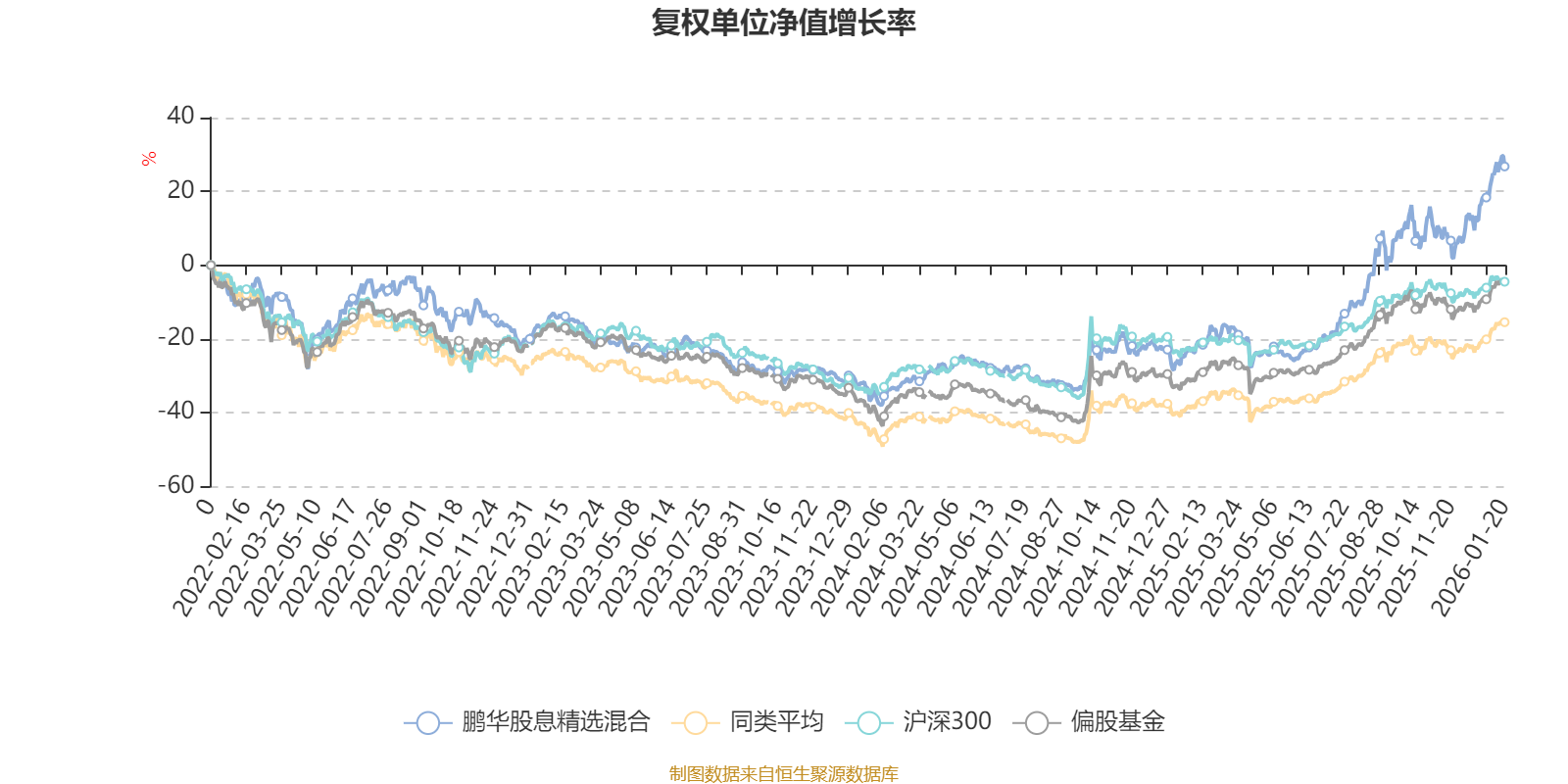 截至1月20日,鹏华股息精选混合近三个月复权单位净值增长率为20.60%,位于同类可比基金64/689;近半年复权单位净值增长率为47.48%,位于同类可比基金70/689;近一年复权单位净值增长率为65.32%,位于同类可比基金73/673;近三年复权单位净值增长率为49.04%,位于同类可比基金38/396。