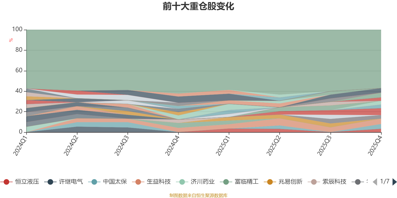 截至2025年四季度末,基金十大重仓股分别是中际旭创、生益科技、中国太保、寒武纪、洛阳钼业、鼎通科技、长芯博创、华虹公司、锡装股份、恒立液压。