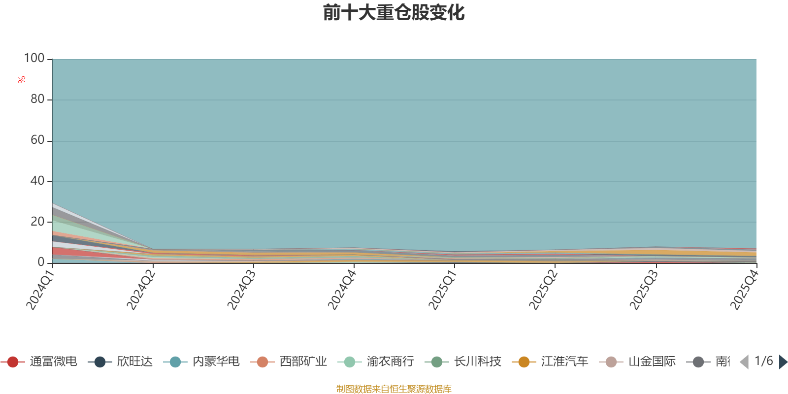 截至2025年四季度末,基金十大重仓股分别是胜宏科技、华工科技、巨人网络、先导智能、赤峰黄金、芯原股份、中矿资源、长川科技、蓝色光标、卧龙电驱。