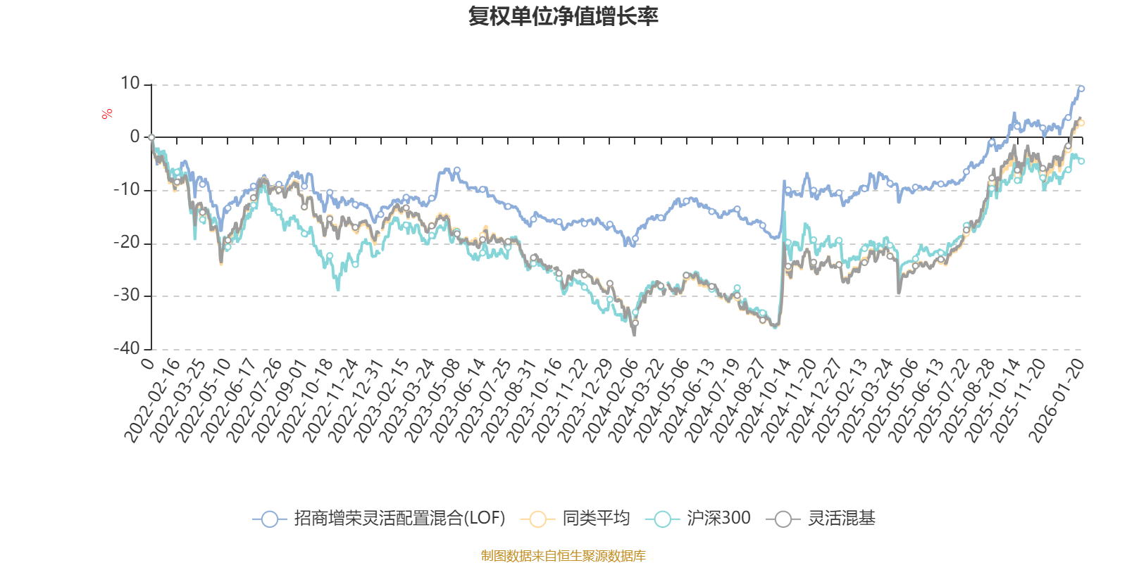 截至1月20日,招商增荣灵活配置混合(LOF)近三个月复权单位净值增长率为8.23%,位于同类可比基金676/1286;近半年复权单位净值增长率为18.01%,位于同类可比基金747/1286;近一年复权单位净值增长率为22.77%,位于同类可比基金837/1286;近三年复权单位净值增长率为23.93%,位于同类可比基金455/1286。