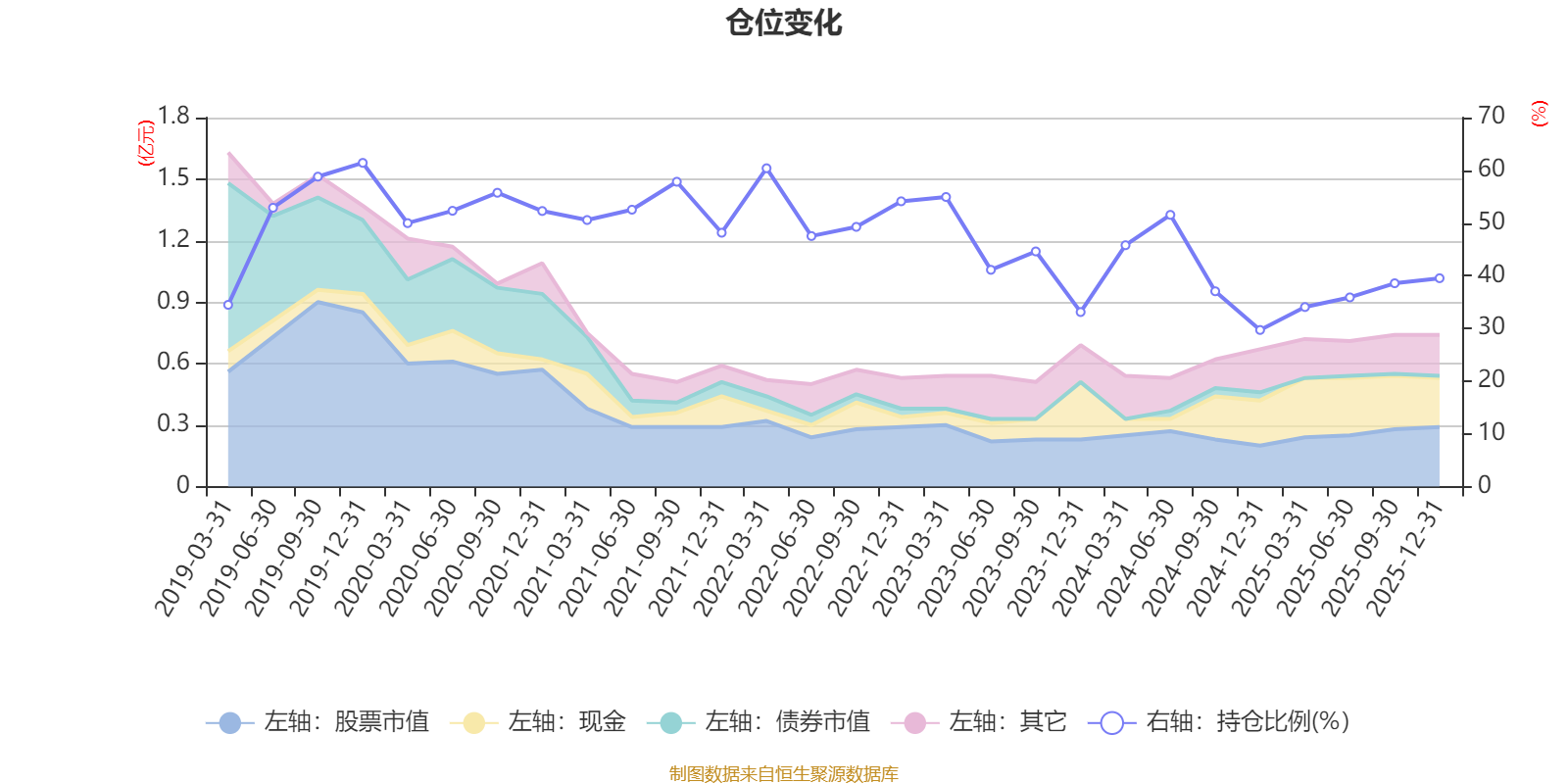 据定期报告数据统计,近三年平均股票仓位为40.49%,同类平均为72.46%。2019年末基金达到61.41%的最高仓位,2024年末最低,为29.71%。