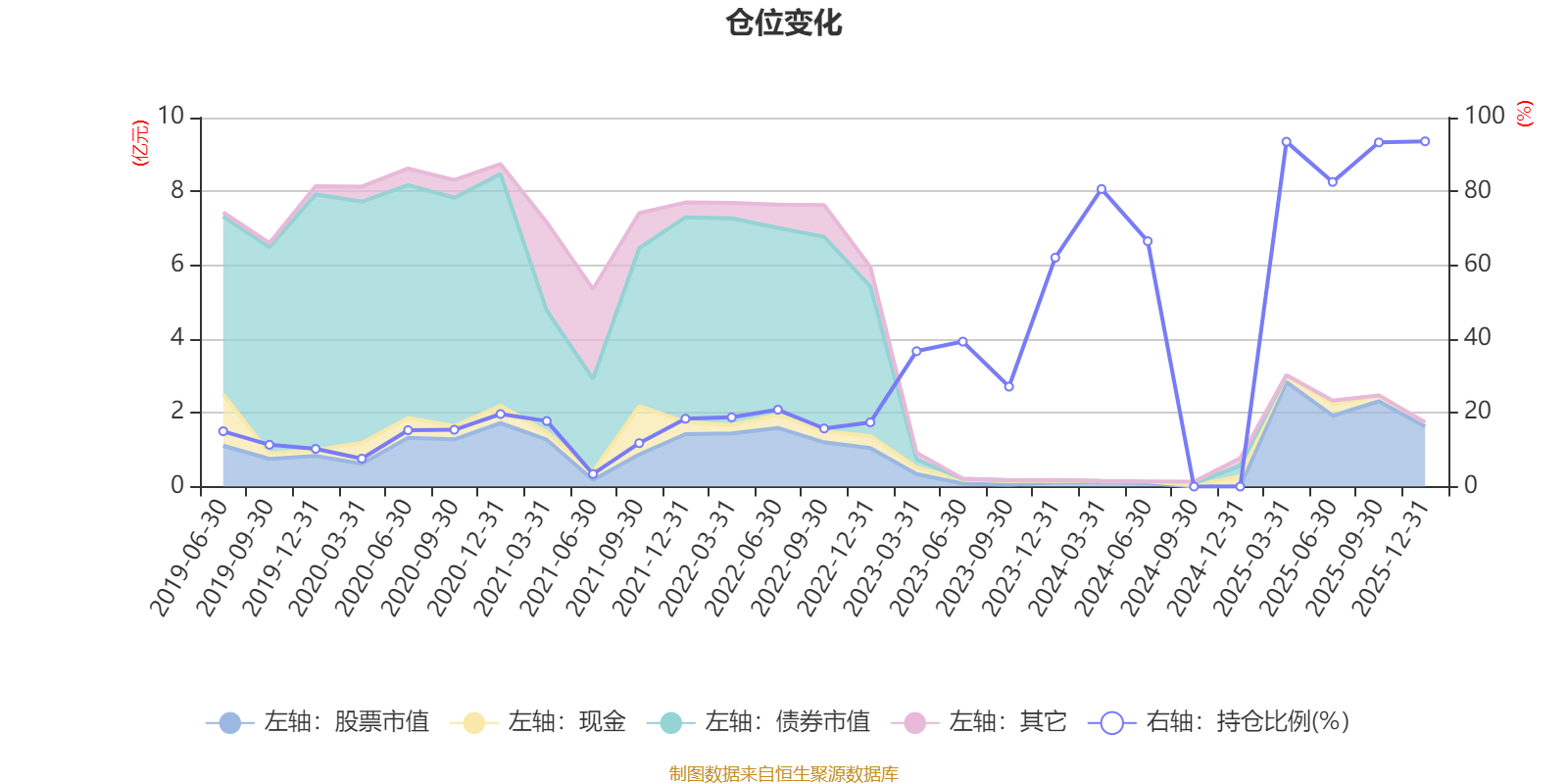 据定期报告数据统计,近三年平均股票仓位为56.26%,同类平均为72.46%。2025年末基金达到93.57%的最高仓位,2021年上半年末最低,为3.41%。