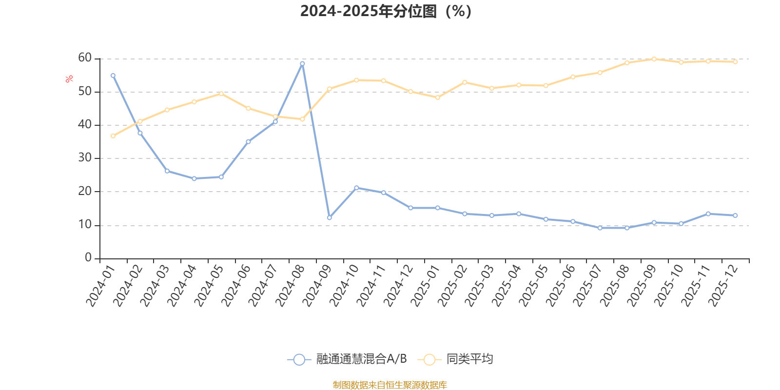 通过所选区间该基金净值增长率分位图,可以观察该基金与同类基金业绩比较情况。图为坐标原点到区间内某时点的净值增长率在同类基金中的分位数。