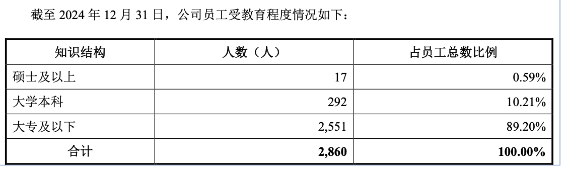 更引人关注的是公司的员工构成,截至2024年末,公司大专及以下学历员工占比高达89.20%,而本科和硕士及以上学历员工占比分别仅为10.21%和0.59%,研发人员占比为6.64%。对于一家现代化制造企业来说,高义包装的人才结构与其“国家高新技术企业”的定位及包装行业日益提升的自动化、智能化需求相比,显得不太匹配,这也可能成为其长期创新能力和管理效率提升的瓶颈。