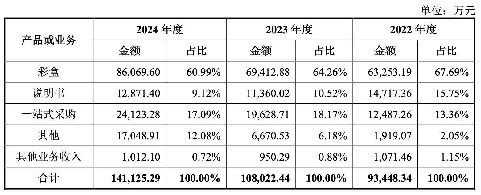 所谓“一站式采购”,是指客户在采购高义包装自产的彩盒时,还需要纸箱、纸托、标签、泡棉等辅助材料,高义包装并不生产这些材料,而是向第三方采购并转手卖给客户。2022年到2024年间,一站式采购分别为公司提供的收入为1.25亿元、1.96亿元和2.41亿元,占主营业务收入的比重分别是13.36%、18.17%和17.09%。