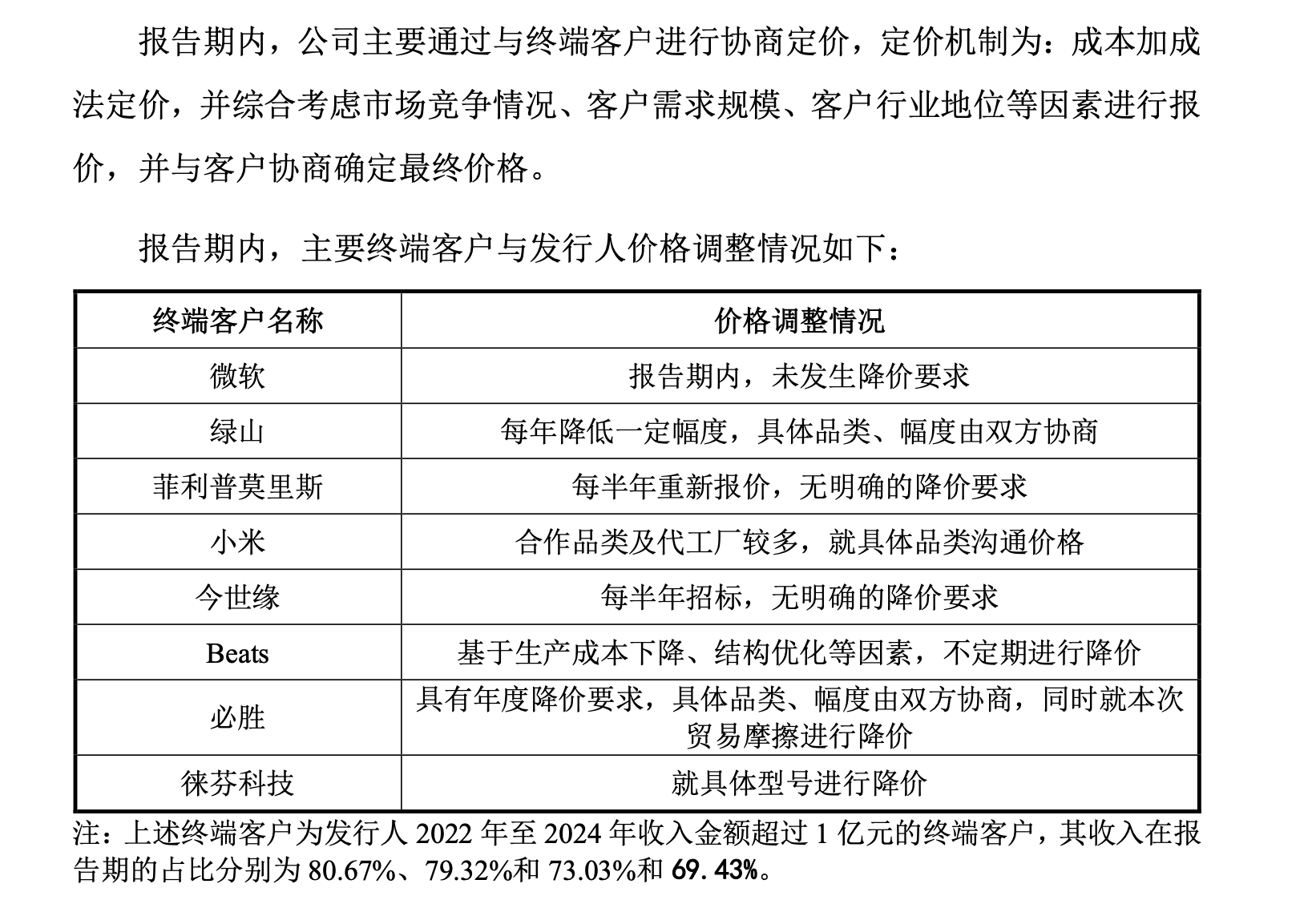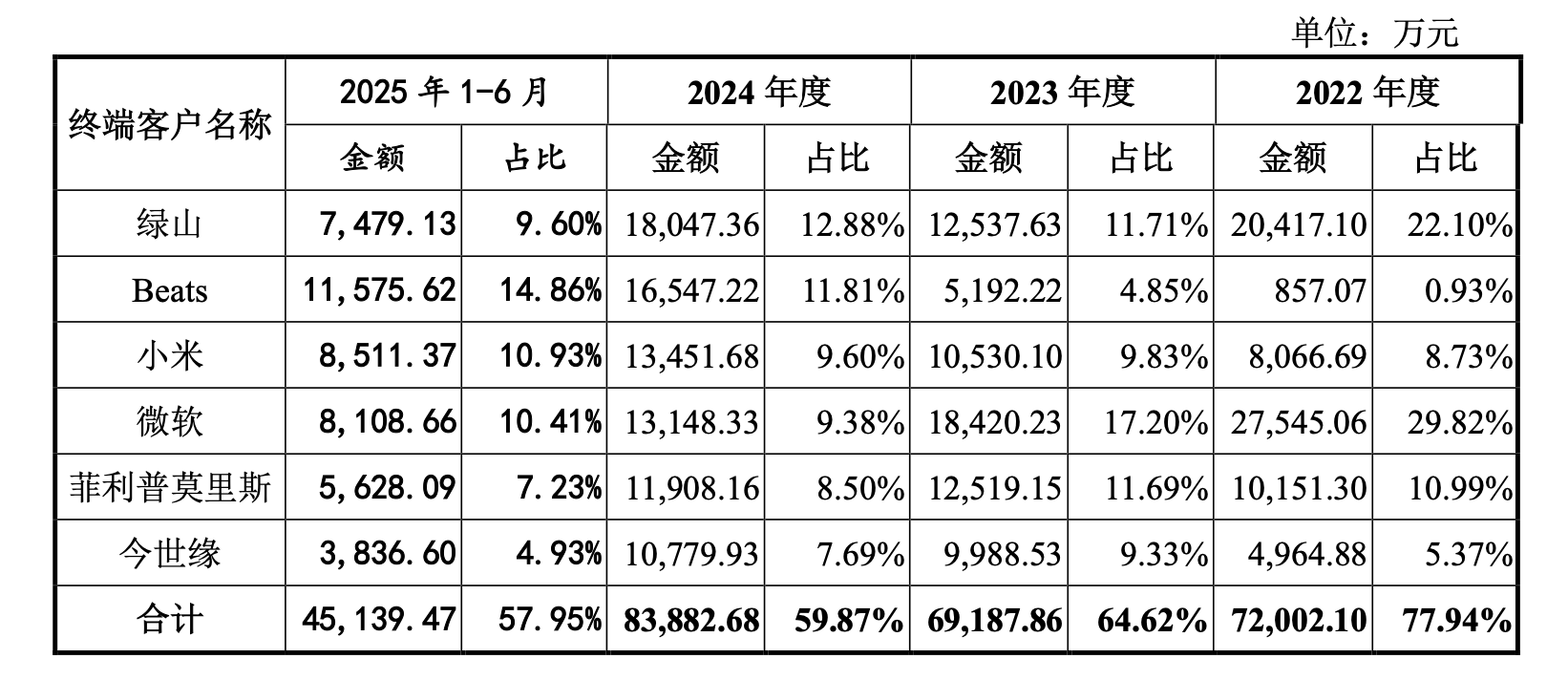 与此同时,受到宏观经济的影响,消费电子行业本身就存在强周期性,比如2023年开始微软宣布停止生产和销售Microsoft品牌的电脑配件,旨在将硬件重心放在高利润的Surface品牌,这带来的结果是公司向微软销售收入的下滑,报告期内分别为2.75亿元、1.84亿元、1.31亿元和8109万元;另外,由于绿山对其代工厂的订单逐步从泰国转移至马来西亚等地,导致泰国区域对公司采购额出现下滑,报告期内公司在泰国地区的收入分别为4998万元、2889万元、1739万元和790万元。