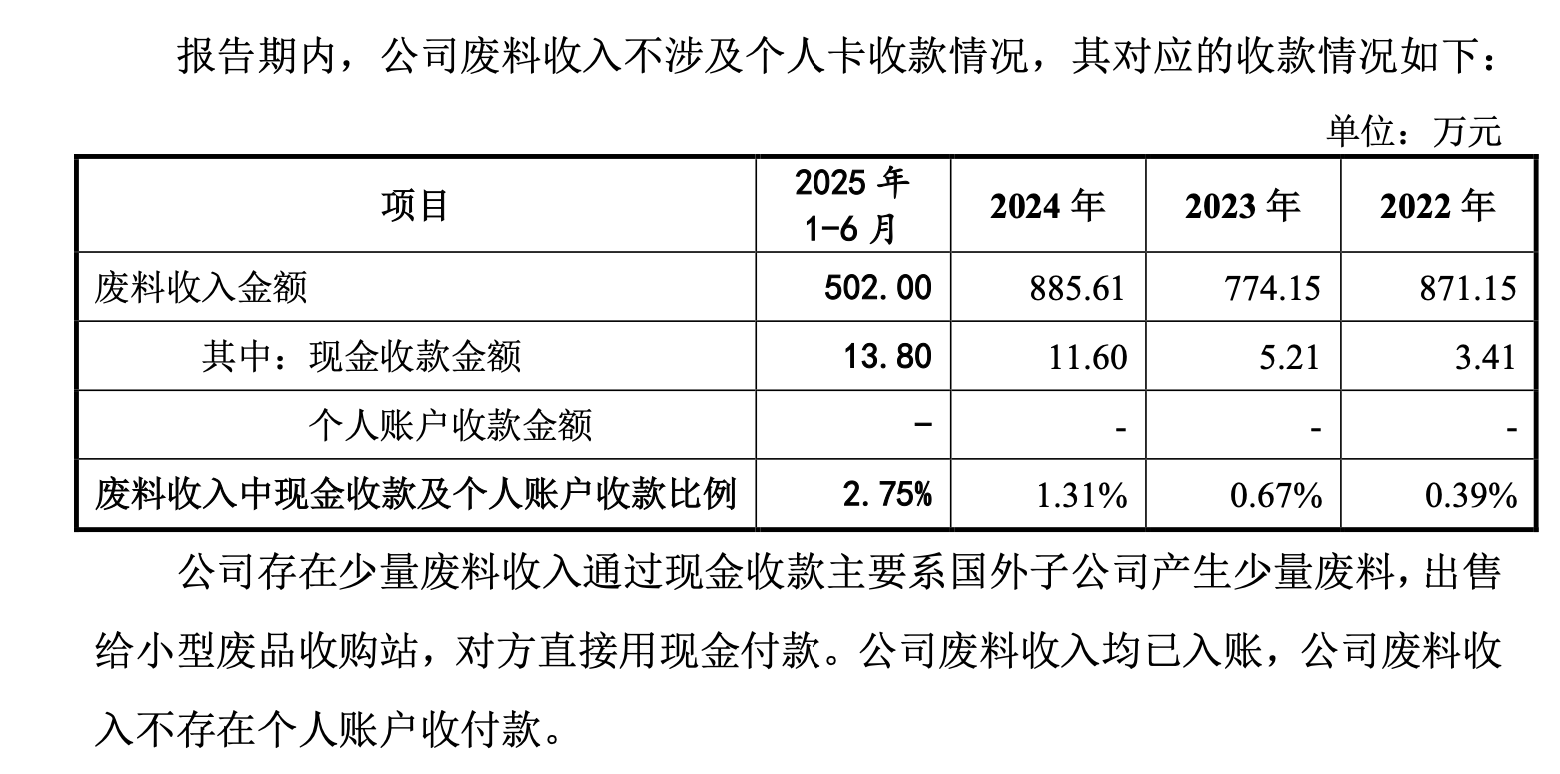 对此,公司在回复中披露,报告期内废料收入分别为871万元、774万元、886万元和502万元,其中少量现金收款主要由于国外子公司将废料出售给小型废品收购站,对方直接用现金付款所致,不存在个人账户收付款,废料收入均已入账。