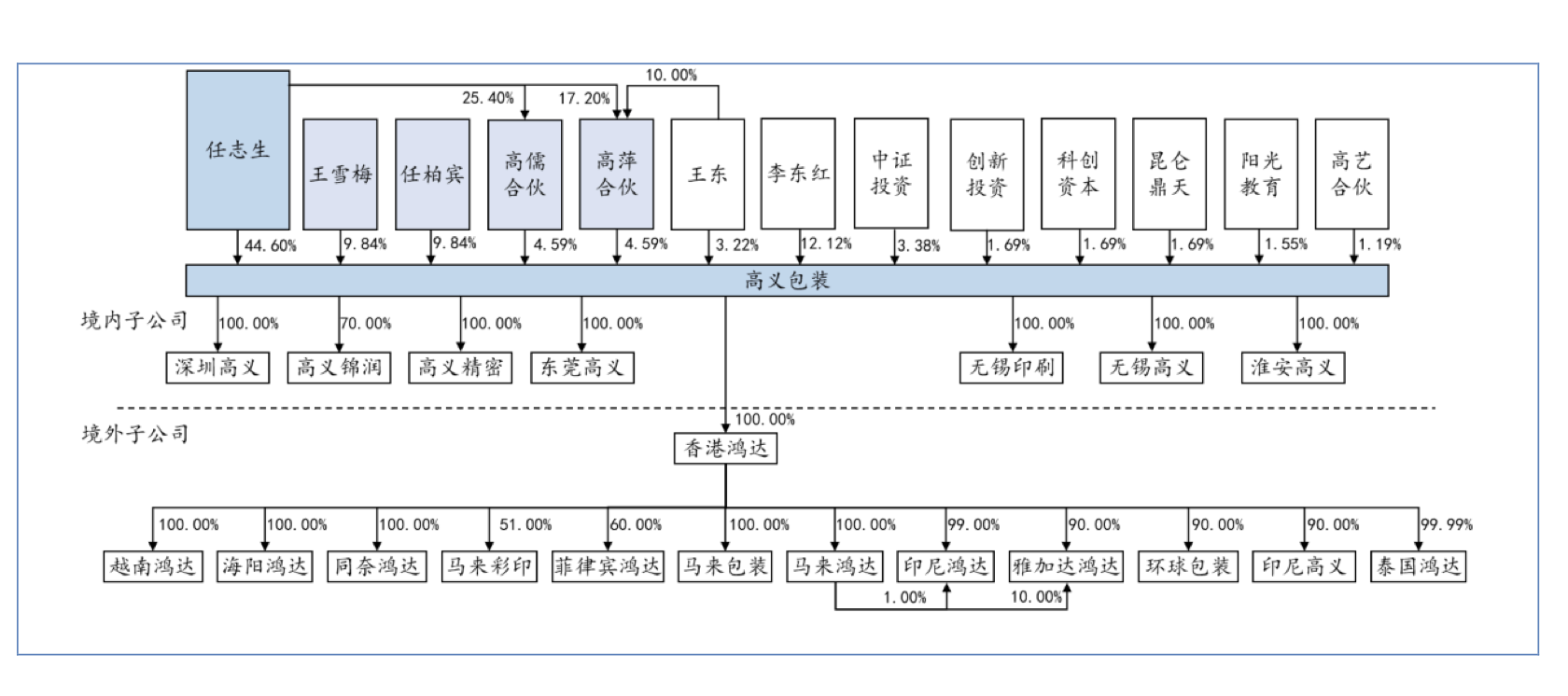 高义包装的股权结构呈现典型的家族控制特征。实际控制人任志生直接持股44.60%,其子任柏宾和配偶王雪梅各持有9.84%股份,通过高萍合伙和高儒合伙两个持股平台,任氏家族合计掌控了73.47%股份。另外,公司股东高艺合伙的部分合伙人也与任志生存在亲属关系,任春华、任贤忠、任贤喜、任雪辉为其兄弟的子女,王冬梅、王红梅、王俊桦为其妻子的兄弟姐妹,这种家族集中持股的结构也引发了对于中小股东利益保护机制的担忧。