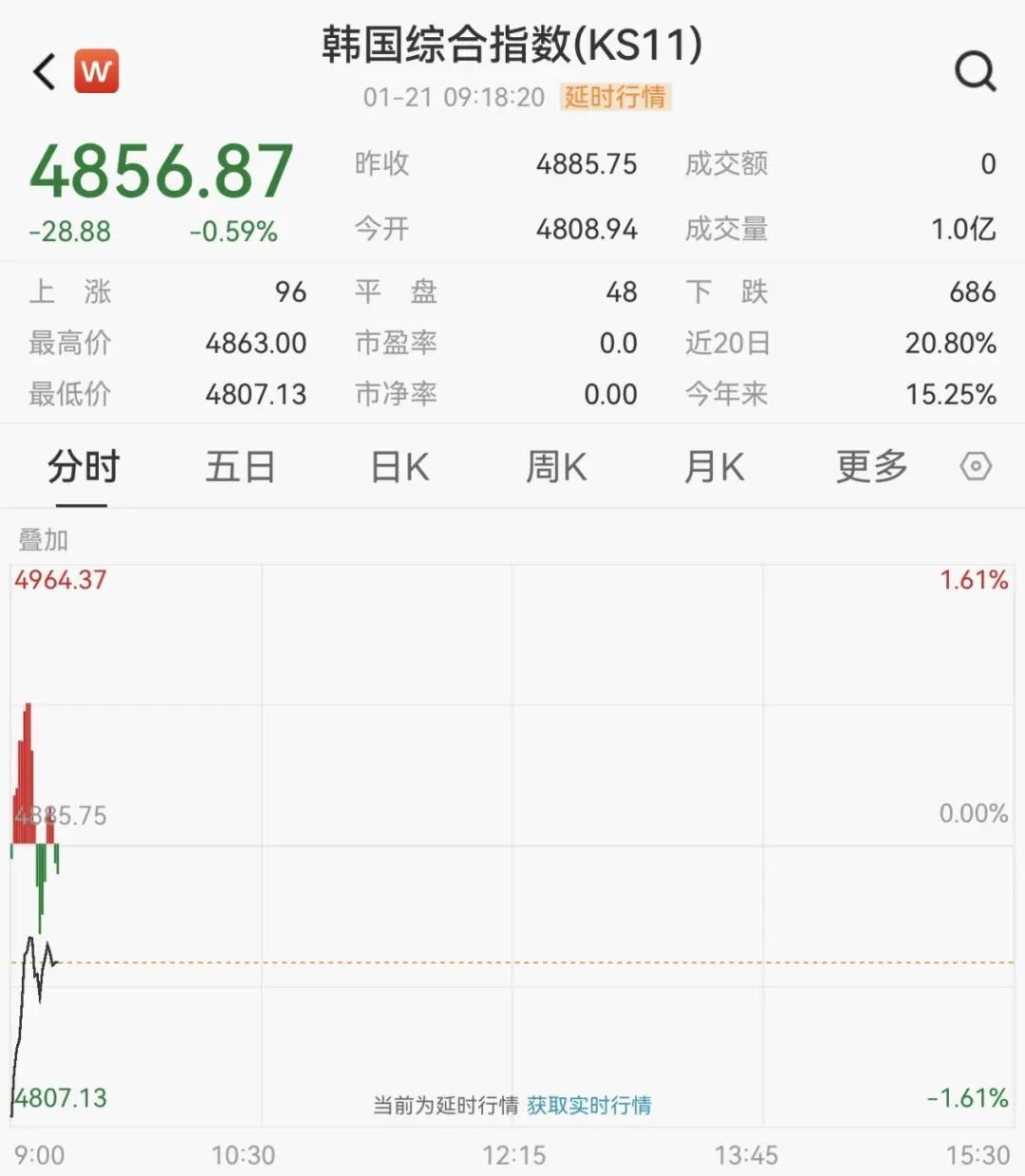 韩国综合股价指数开盘下跌1.6%,随后震荡拉升。