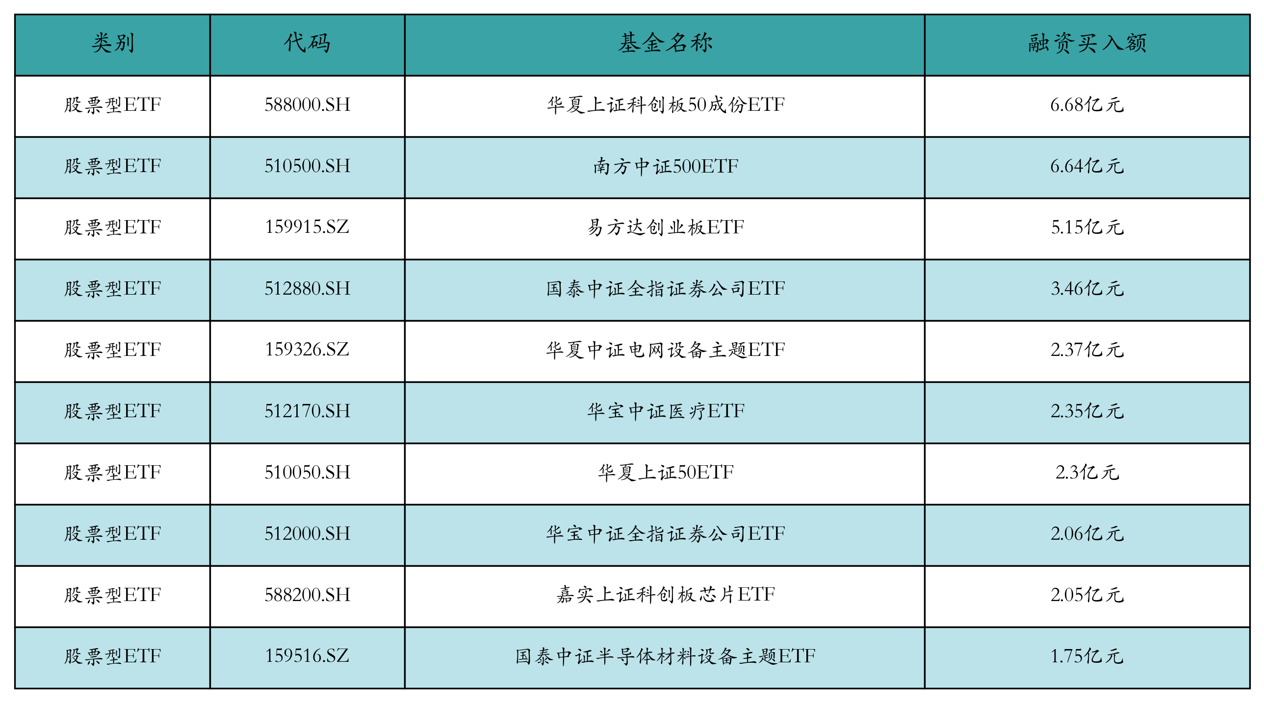 昨日股票型ETF融资买入额最高的3只ETF及其买入金额分别为:华夏上证科创板50成份ETF(6.68亿元)、南方中证500ETF(6.64亿元)、易方达创业板ETF(5.15亿元)。融资买入额前10详情见下表:
