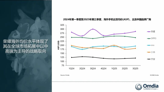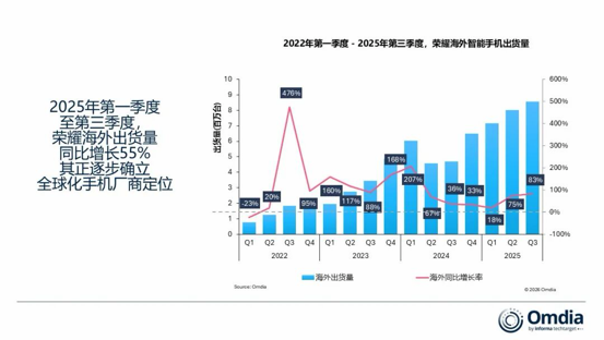 Omdia分析师Lucas Zhong向记者指出:“过去五年,荣耀的国际业务经历了结构性转变。2021年初,海外市场出货量占其全球总量的比例仍不足10%;至2025年第三季度,该比例已接近50%。这一变化标志着荣耀发展路径中的重要战略拐点,海外业务已从早期的边际增量来源,演进为支撑出货量规模扩张、区域多元化以及长期经营韧性的核心支柱。”