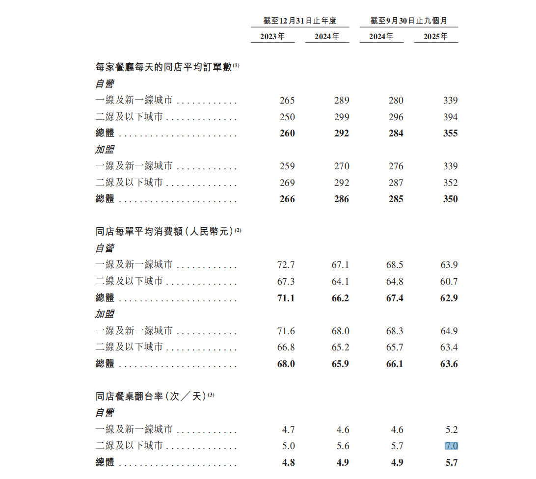 招股书披露,比格披萨门店拥有惊人的客流量。2024年,比格披萨一线城市自营门店的翻台率达到4.6,二线及以下城市则5.7,截至2025年前三季度,两者更是分别达到5.2和7。近年来,公司翻台率不断提升。