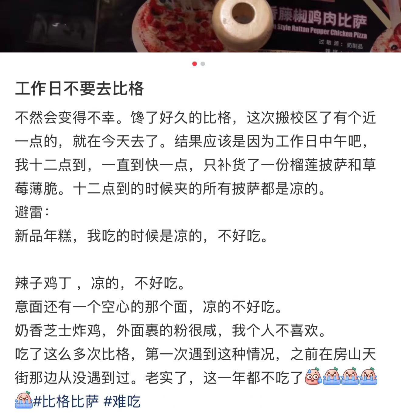 社交平台上有消费者反馈,工作日就餐的比格门店人流量较低,比格披萨门店放冷后影响口感,并称近期都不会再去。