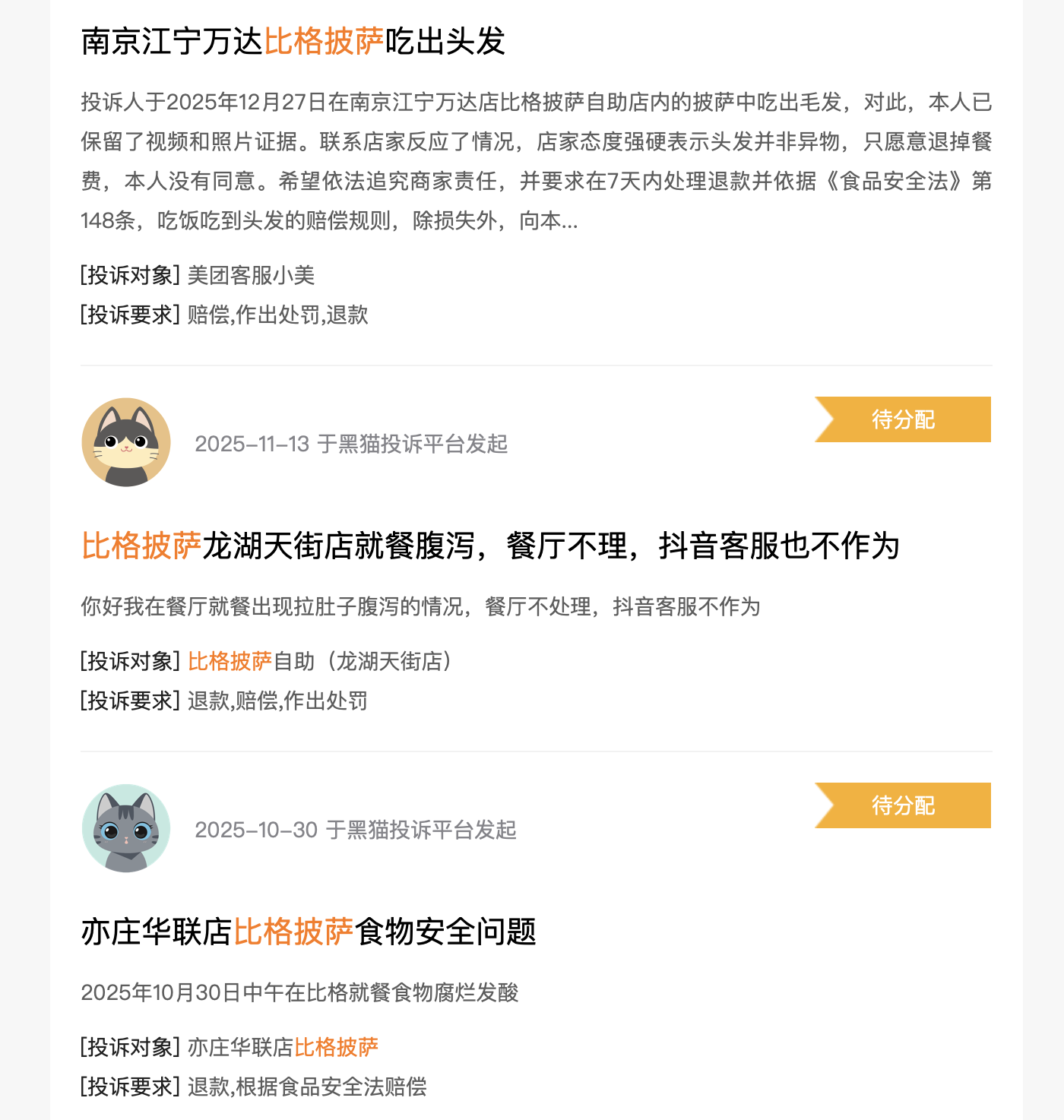 黑猫投诉平台上,近期关于比格披萨的食品安全投诉较多。“比格”相关共443条投诉,主要涉及到比格披萨,大部分是披萨吃出毛发、腹泻、食物腐烂发酸等食品问题。也有消费者对于比格披萨一家门店的上菜速度不满,投诉称半个小时才出炉一张披萨;另有消费者发起投诉,花五十多元,冬天吃到的披萨全都是凉的。