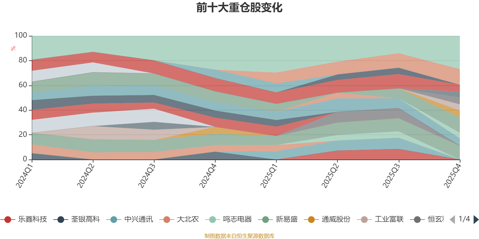 该基金持股集中度较高,近2年前十大重仓股集中度长期超过60%。截至2025年四季度末,基金十大重仓股分别是兆易创新、中际旭创、新易盛、天孚通信、巨人网络、海光信息、工商银行、陕西煤业、长江电力、山西焦煤。