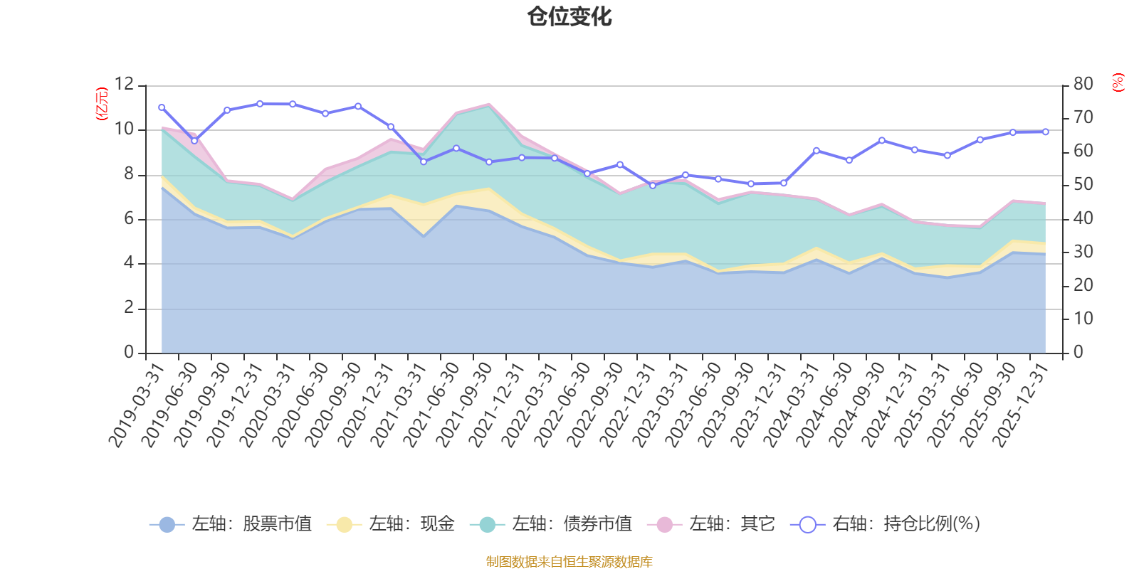据定期报告数据统计,近三年平均股票仓位为58.67%,同类平均为72.46%。2019年末基金达到74.5%的最高仓位,2022年末最低,为50.05%。