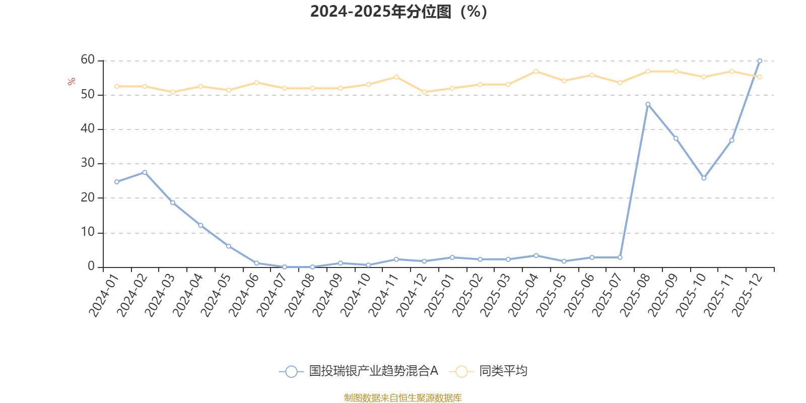 通过所选区间该基金净值增长率分位图,可以观察该基金与同类基金业绩比较情况。图为坐标原点到区间内某时点的净值增长率在同类基金中的分位数。