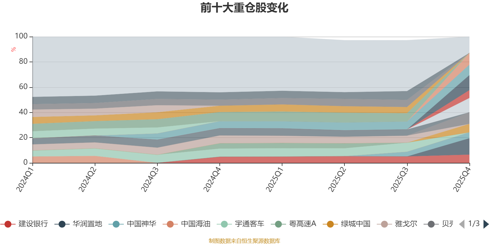 该基金持股集中度较高,且持股标的较为稳定。截至2025年四季度末,基金十大重仓股分别是华润置地、中际旭创、保利置业集团、招商蛇口、贝壳-W、工商银行、绿城中国、建设银行、立讯精密、中国神华。