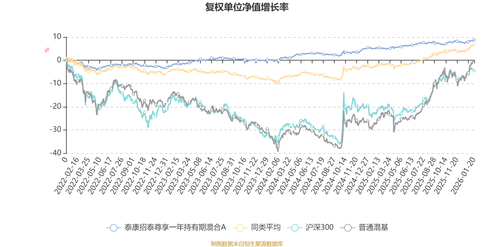 截至1月20日,泰康招泰尊享一年持有期混合A近三个月复权单位净值增长率为1.25%,位于同类可比基金453/629;近半年复权单位净值增长率为1.19%,位于同类可比基金569/629;近一年复权单位净值增长率为3.52%,位于同类可比基金546/626;近三年复权单位净值增长率为10.85%,位于同类可比基金307/564。