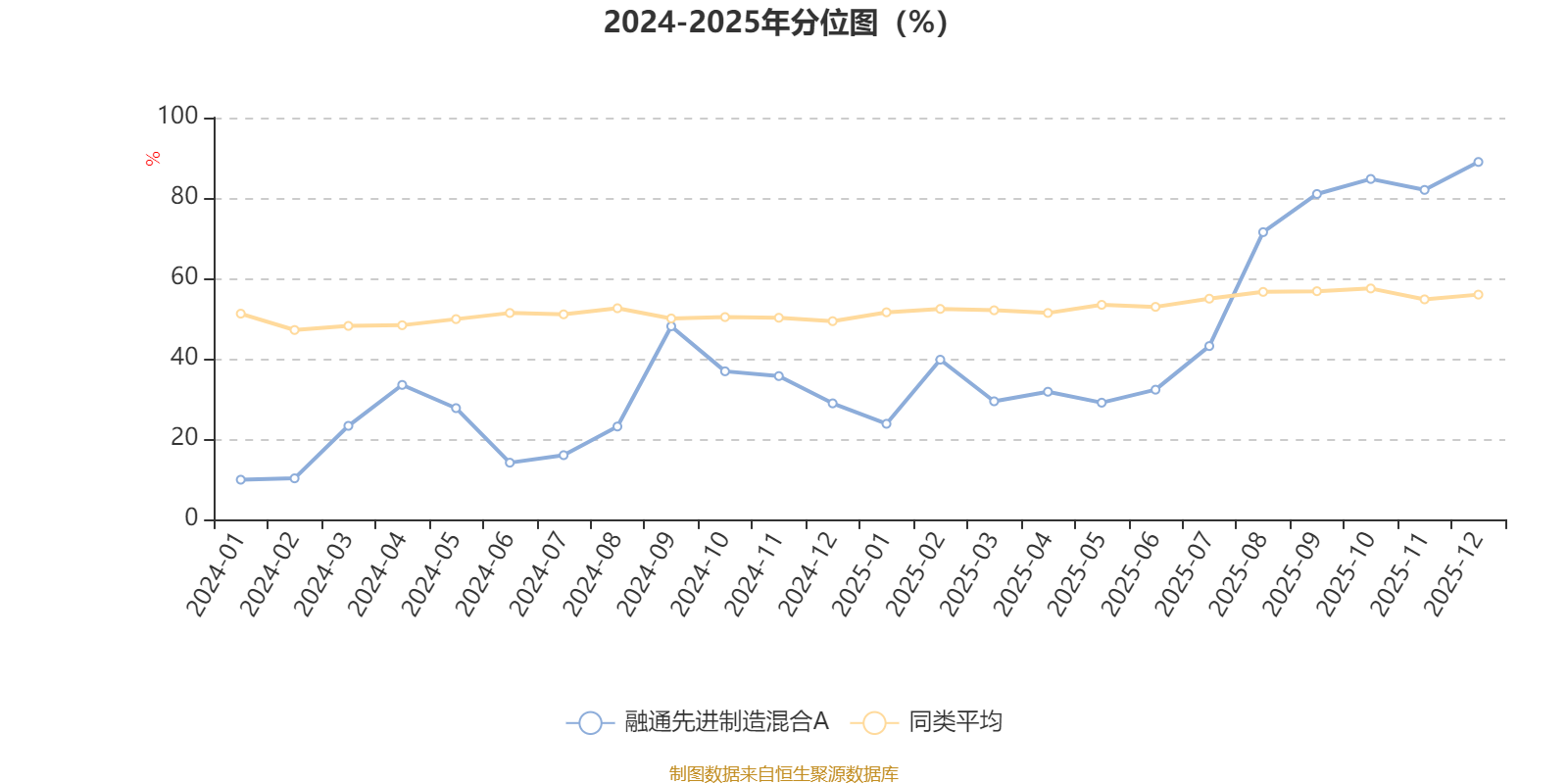 通过所选区间该基金净值增长率分位图,可以观察该基金与同类基金业绩比较情况。图为坐标原点到区间内某时点的净值增长率在同类基金中的分位数。