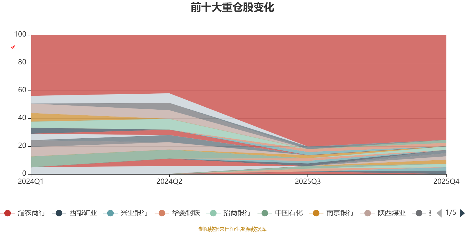 截至2025年四季度末,基金十大重仓股分别是南京银行、山煤国际、鄂尔多斯、陕西煤业、兴业银行、招商银行、西部矿业、美的集团、上峰水泥、江苏银行。