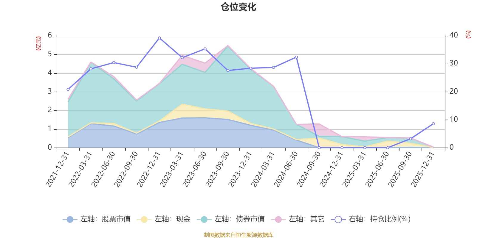 据定期报告数据统计,近三年平均股票仓位为16.35%,同类平均为19.04%。2022年末基金达到39.2%的最高仓位,2025年三季度末最低,为3.19%。