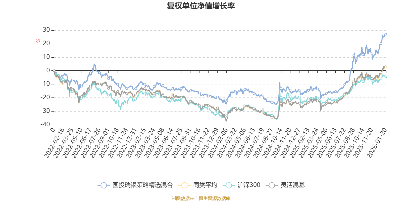 截至1月20日,国投瑞银策略精选混合近三个月复权单位净值增长率为14.11%,位于同类可比基金331/1286;近半年复权单位净值增长率为43.06%,位于同类可比基金208/1286;近一年复权单位净值增长率为50.53%,位于同类可比基金300/1286;近三年复权单位净值增长率为38.82%,位于同类可比基金258/1286。