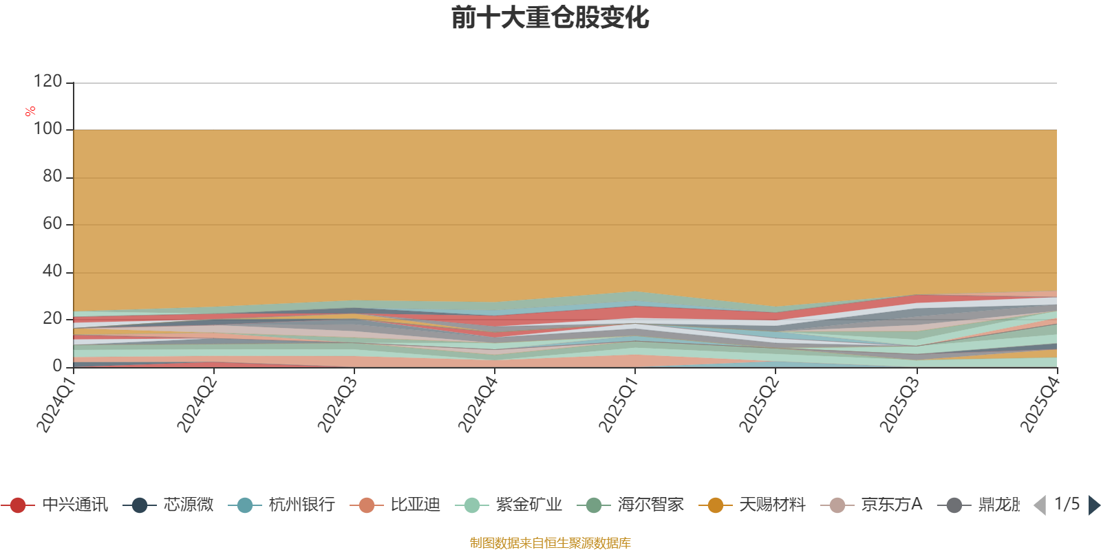 截至2025年四季度末,基金十大重仓股分别是中国铝业、紫金矿业、寒武纪、天赐材料、洛阳钼业、麦格米特、中国平安、海光信息、桐昆股份、巨化股份。