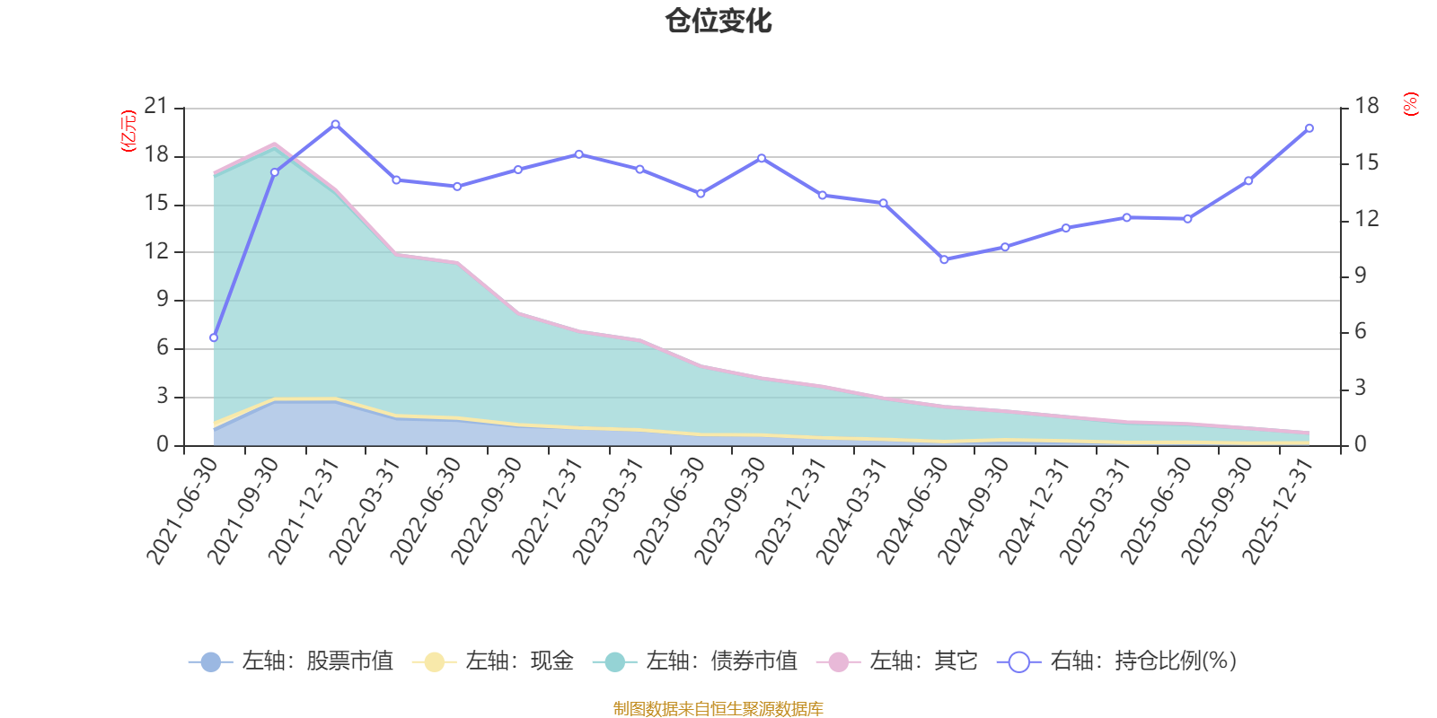 据定期报告数据统计,近三年平均股票仓位为13.09%,同类平均为19.13%。2021年末基金达到17.12%的最高仓位,2021年上半年末最低,为5.75%。