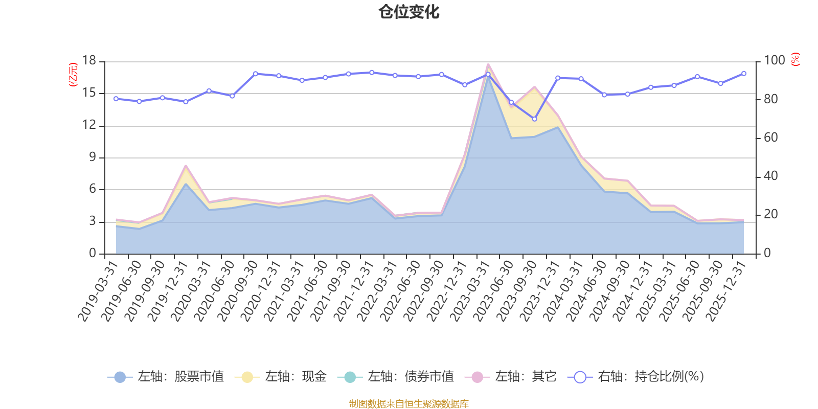 据定期报告数据统计,近三年平均股票仓位为86.52%,同类平均为72.46%。2021年末基金达到94.22%的最高仓位,2023年三季度末最低,为70.05%。